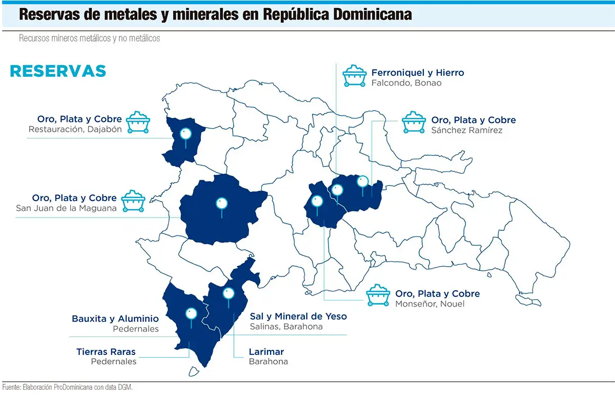 El eslogan popular “República Dominicana lo tiene todo” se asocia con la actividad turística, sin embargo, la minería no es la excepción, ya que el país cuenta con reservas de oro, plata, cobre, hierro, ferroníquel, aluminio, ámbar, bauxita y larimar, convirtiendo este último a Quisqueya en el único lugar en el mundo que ostenta esta piedra semipreciosa.
