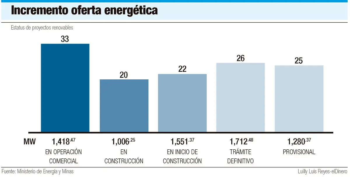 Datos del Ministerio de Energía y Minas establecen que actualmente hay 33 proyectos en operaciones (1,400 megavatios), mientras que otros 20 están en construcción (1,006 megavatios), en tanto que otros 51 (casi 3,000 megavatios) están en proceso de trámite.