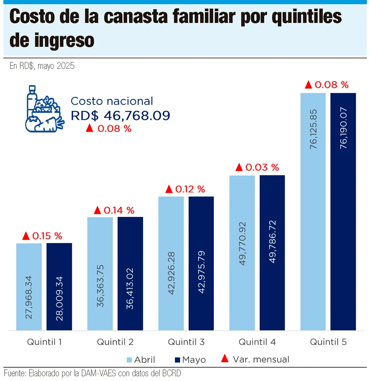 Datos del Banco Central dominicano indican que el costo promedio de la canasta básica familiar ascendió a RD$46,768.09 en mayo de este año, equivalente a un incremento nominal de RD$39.59 (0.08%) respecto al mes anterior. La canasta básica de los hogares con menores ingresos, es decir, del primer quintil, se ubicó en RD$28,009.34.
