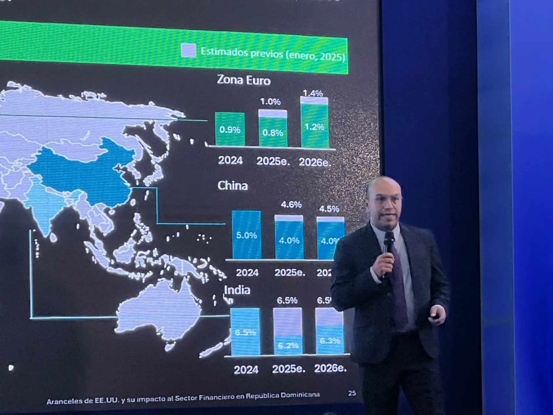 Al dictar la conferencia “Repercusiones económicas para República Dominicana y la región centroamericana”, en el desayuno-conferencia Repercusiones y riesgos de la política arancelaria de Estados Unidos sobre el sector financiero de República Dominicana, dijo que, a nivel global, se espera una reducción del crecimiento económico del 3.3% al 2.8% para este año.