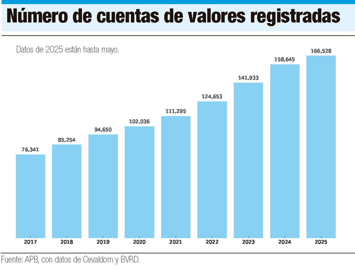 El mercado dominicano tiene actualmente 166, 528 cuentas de corretaje abiertas, lo que representa un incremento del 118.1% en los últimos nueve años. En 2017 había 76,341 cuentas registradas y para mayo de 2025 la cifra llegó a 158,645. Solo en los primeros cinco meses del año se abrieron 7,883 nuevas cuentas, según estadísticas oficiales de la APB.