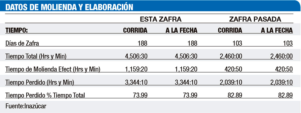 Según el reporte del Instituto Azucarero Dominicano (Inazúcar), el rendimiento fabril fue sólo 0.94%. Los reportes oficiales establecen que durante la zafra pasada hubo un registro de 4,506 horas de molienda corrida, de las cuales apenas 1,159 fueron efectivas y se perdieron 3,344, para un 74% de tiempo perdido en el proceso.