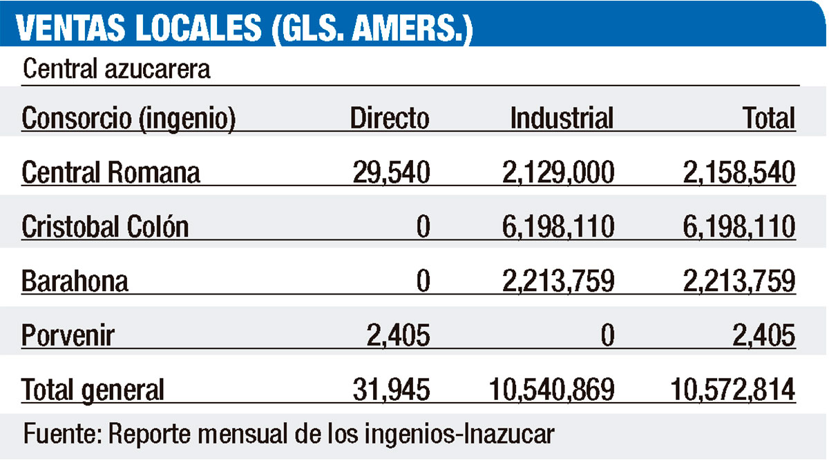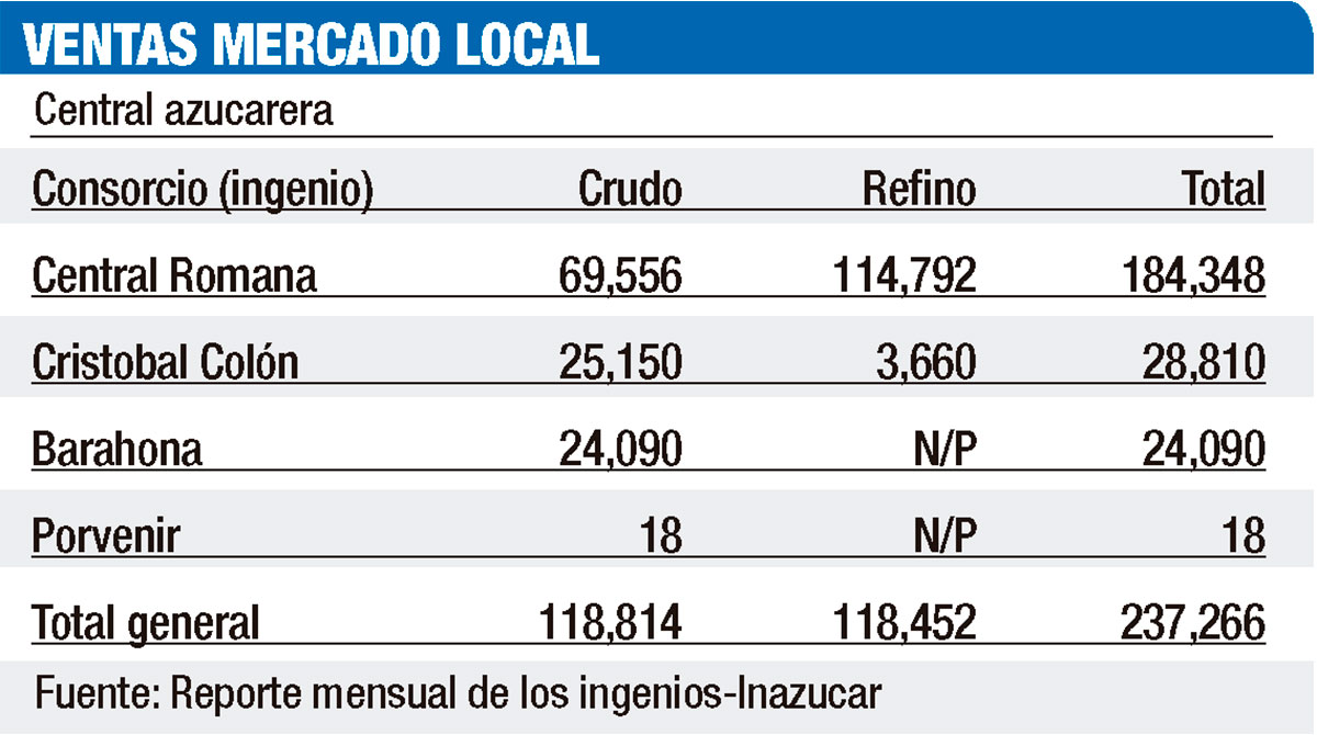 En cambio, el Central Romana vendió en total 184,348 toneladas en el mercado local, un 77.7%, mientras que Cristóbal Colón fueron 28,810 (12.1%) y Barahona un total 24,090 toneladas vendidas localmente, para un 10.2%.