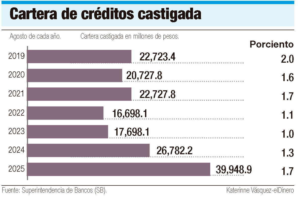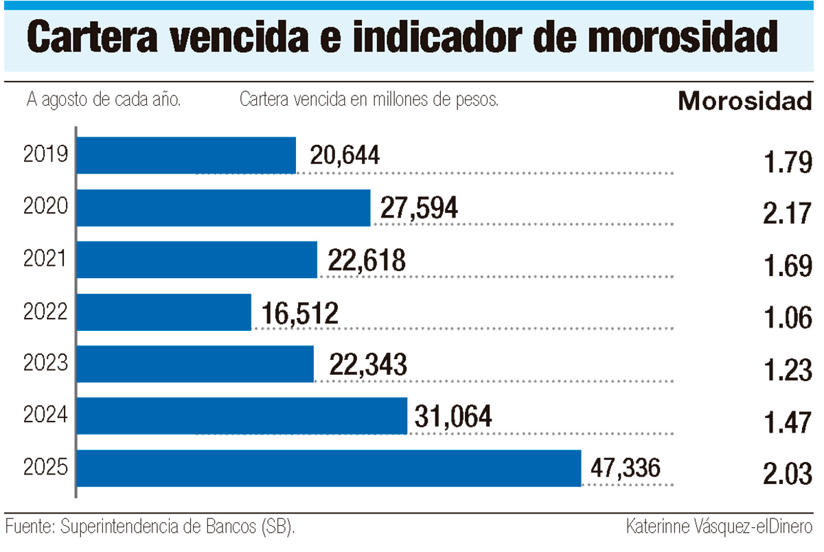 El comportamiento del índice de morosidad muestra una tendencia al alza. Al cierre de 2019, la tasa de morosidad de la cartera vencida era del 1.70%, pero durante la pandemia, en mayo de 2020, se disparó al 2.52%. Aunque hubo una disminución en los años siguientes, desde junio de 2021 la tasa se mantuvo por debajo del 2% hasta agosto de 2025, cuando comenzó a superar este umbral crítico.