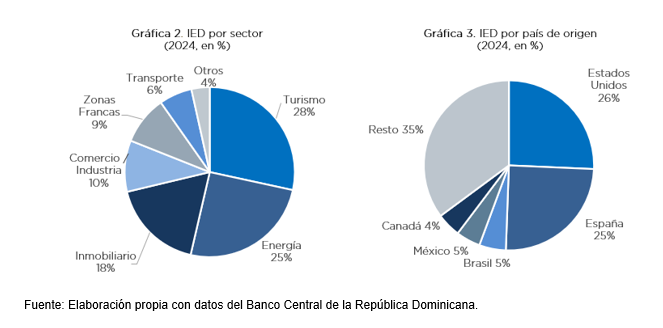El buen desempeño de la IED en la República Dominicana se refleja también en su composición sectorial y en la participación de los países de procedencia. En este sentido, al cierre de 2024, tres sectores concentraron más del 70% de los flujos de inversión extranjera, confirmando su importancia en la estructura productiva nacional: turismo, energía e inmobiliario (ver gráfica 2).