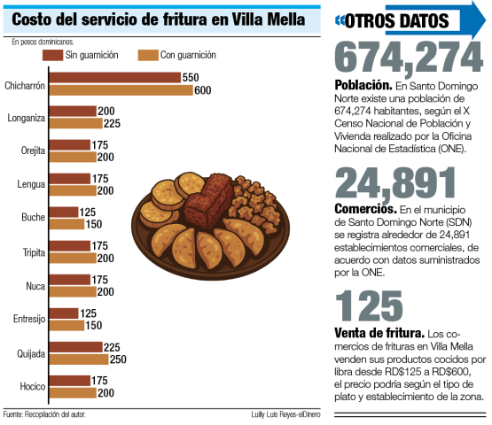 En un recorrido realizado por elDinero en la calle Ramón Matías Mella, considerada como la principal vía para la comercialización de la gastronomía villamellera, se pudo contabilizar apenas dos puestos de chicharrones. En esta histórica avenida ya no se observan a las cazaberas en las plazoletas, ni las hileras de frituras y menos los puestos para la venta de bobotes.