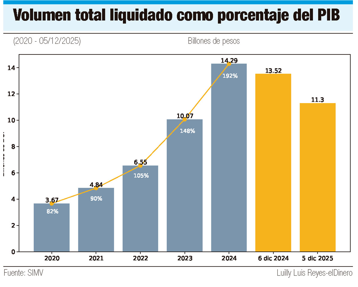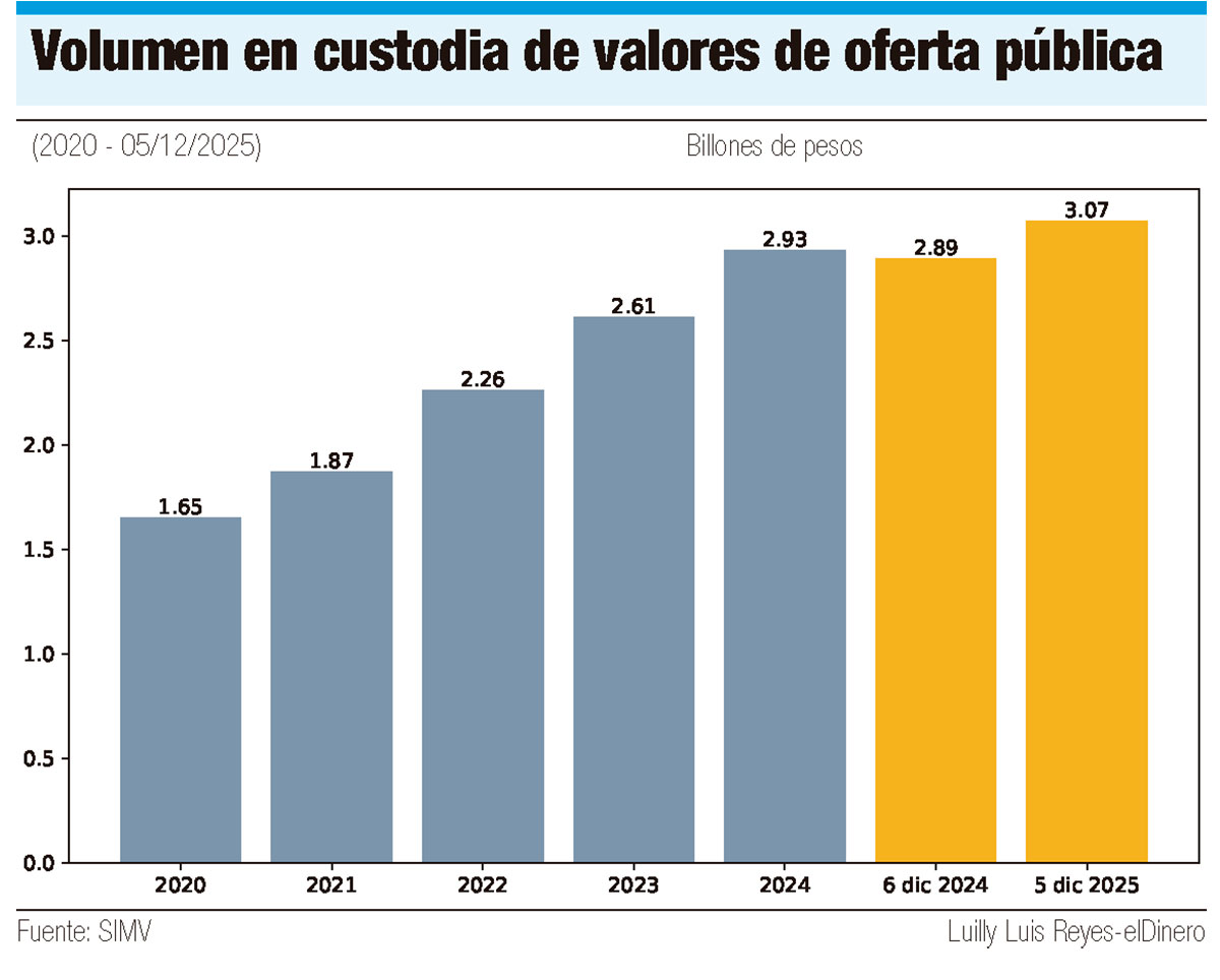 Los valores en custodia, de acuerdo con la SIMV, cerraron 2024 en RD$2.93 billones, mientras que en la primera semana de este mes el monto llegó a RD$3.07 billones. El volumen total liquidado al 5 de este mes fue de RD$11.3 billones.