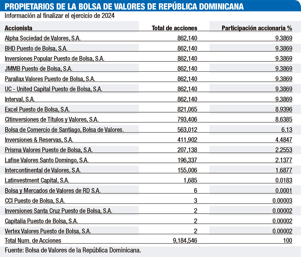 A octubre de 2024, según el Informe Anual del Gobierno Corporativo de la Bolsa de Valores de la República Dominicana (BVRD), el capital social autorizado ascendió a RD$1,000 millones, mientras que el capital suscrito y pagado aumentó a RD$918,454,600, dividido en 9,184,546 acciones con un valor nominal de RD$100 cada una.