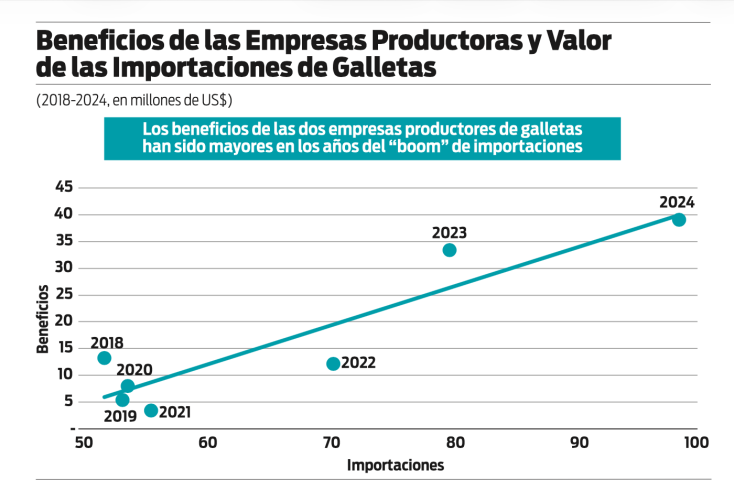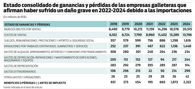 Dos de las principales empresas productoras de galletas establecidas en el país —que alegan haber sufrido “daño grave” por el aumento de las importaciones y han solicitado a la Comisión de Defensa Comercial (CDC) un arancel adicional de 67.1%— registraron ingresos brutos que pasaron de RD$11,159 millones en 2021 a RD$20,515 millones en 2024, un incremento acumulado de 84%, según un análisis del economista Andrés Dauhajre hijo.