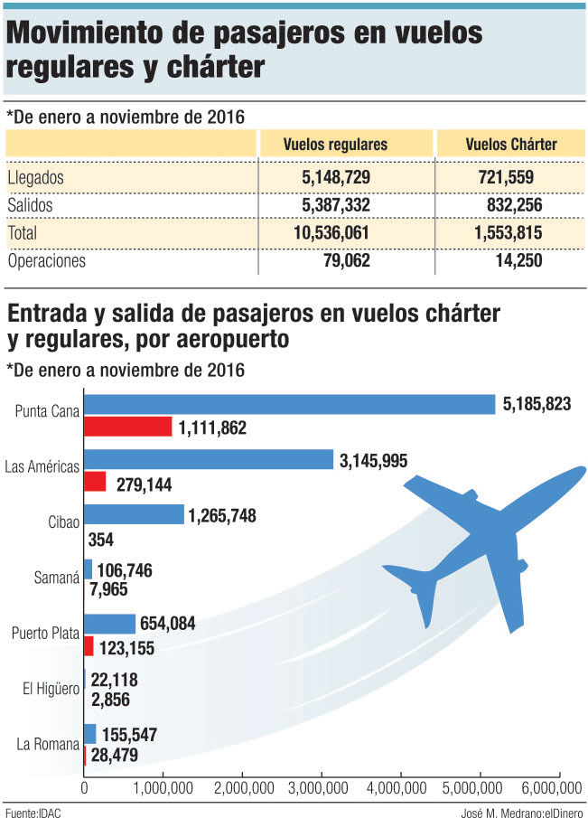 En los primeros 11 meses del año, República Dominicana registró 79,062 operaciones en vuelos regulares, y 14,250 en chárter, sumando 93,312. En 2015 el total fue de 98,648.