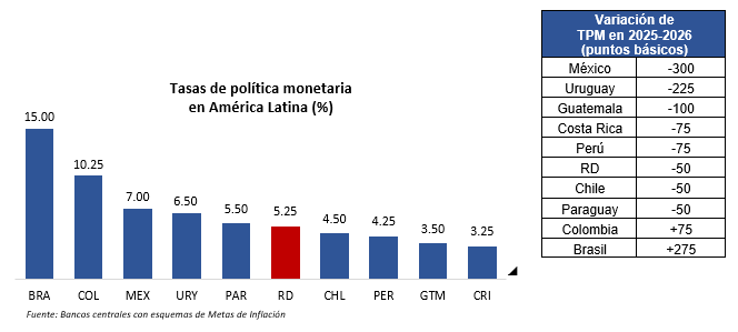 El Banco Central de la República Dominicana (BCRD), en su reunión de política monetaria de febrero de 2026, decidió mantener su tasa de interés de política monetaria (TPM) en 5.25% anual. Asimismo, la tasa de la facilidad permanente de expansión de liquidez (Repos a 1 día) permanece en 5.75% anual, mientras la tasa de depósitos remunerados (Overnight) continúa en 4.50% anual.