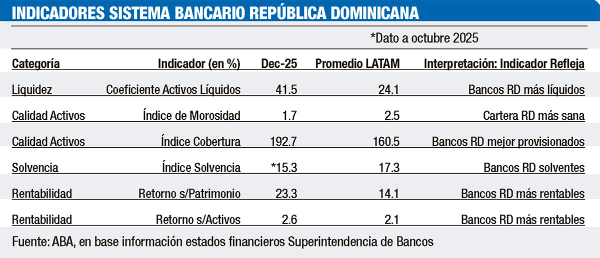 El sistema bancario dominicano concluyó el año 2025 consolidando su posición de liderazgo en América Latina, exhibiendo elevados niveles de liquidez, adecuada capitalización, buena calidad de cartera y rentabilidad superior al promedio regional. Estos resultados adquieren mayor relevancia al considerar que el desempeño se produjo en un contexto internacional caracterizado por altos niveles de incertidumbre económica y geopolítica.