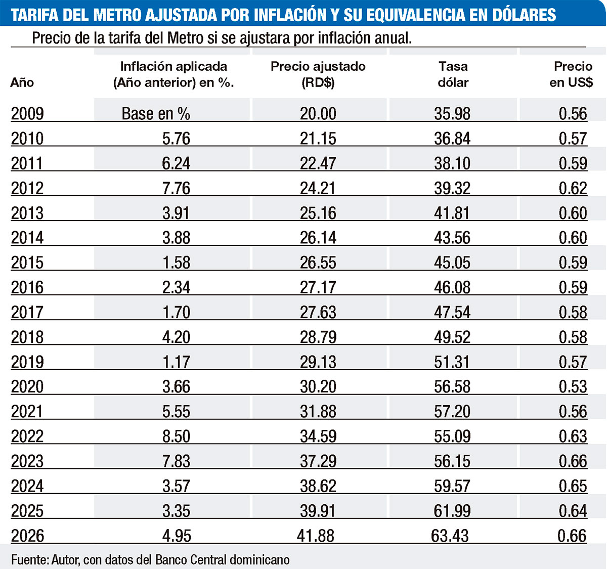 Lo que sí ha cambiado, sin embargo, es el contexto económico del país. Desde 2009 hasta hoy, el Metro se ha expandido hasta convertirse en un Sistema Integrado de Transporte de Santo Domingo (SIT-SD), con apenas variaciones en la tarifa para su uso, lo que no solo ha implicado miles de millones de pesos en subsidios, mientras la inflación acumulada y la evolución del tipo de cambio han transformado el valor real del dinero, aun cuando el precio nominal del pasaje se mantiene intacto.