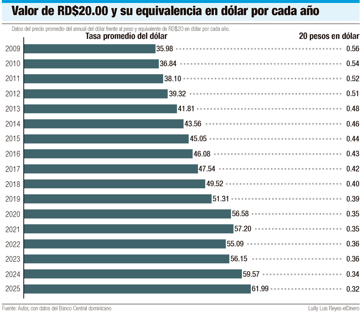 El comportamiento del tipo de cambio también refleja la transformación del valor real del pasaje. En 2009, cuando el Metro inició operaciones, el dólar promedio anual se situaba en RD$35.98. Para 2025, la divisa rondó los RD$61.99, un incremento cercano al 72%.
