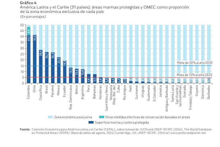 La Cepal destaca que solo Colombia (41.1%) y Chile (41.2%) han rebasado la meta de 2030. Muy cerca del objetivo global está Costa Rica con un 28.4% de protección a sus áreas marinas, mientras que Brasil y Panamá se sitúan en 26.7% y 26.3%, respectivamente. A estas le siguen México (22.2%) y Ecuador (19.3%).