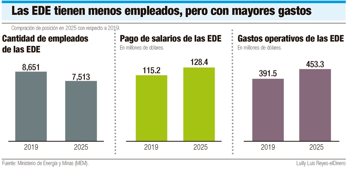 Un elemento que en apariencia es positivo, pero que pierde la parte buena cuando se analiza el costo, es lo relativo a la nómina de empleados de las EDE. En 2019 las tres distribuidoras tenían 8,651 colaboradores; en tanto que, para el 2025 habían bajado a 7,513 servidores, es decir, un 13.1% menos.