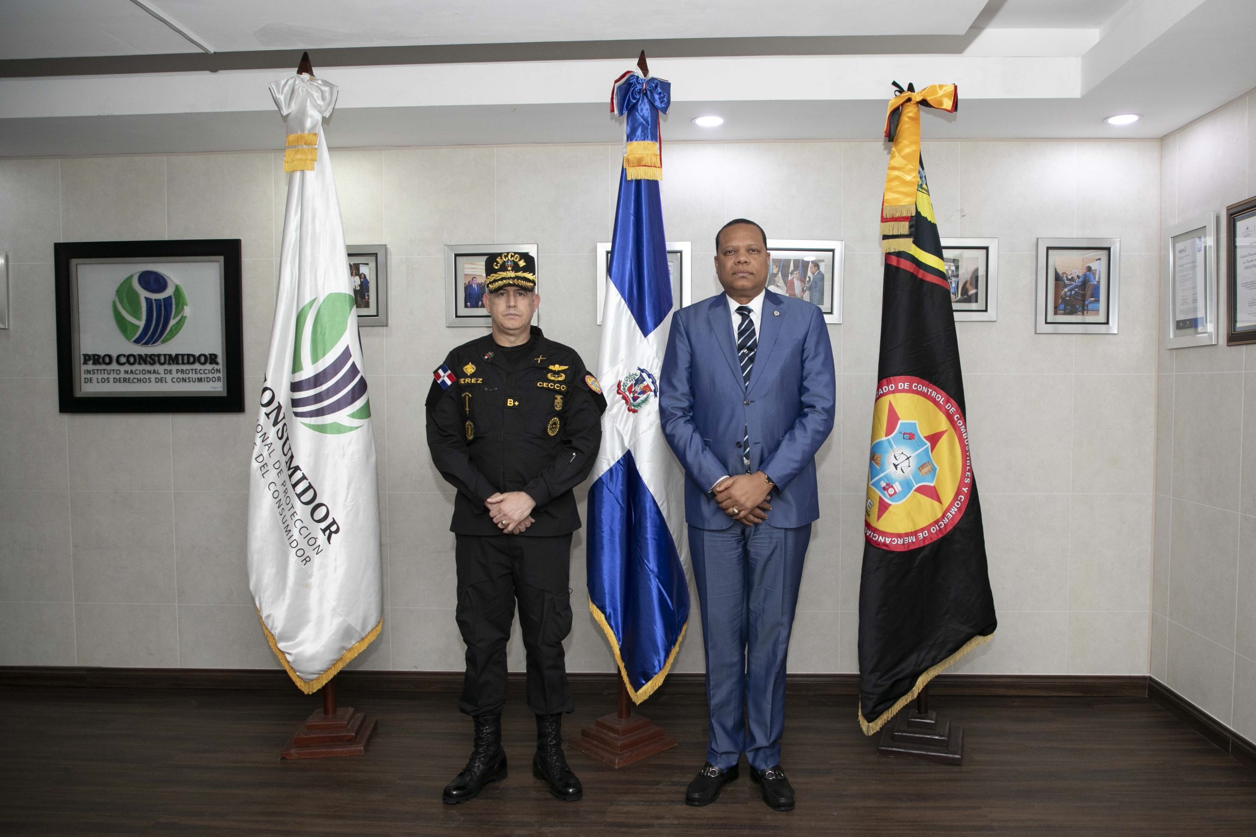 El director ejecutivo de Proconsumidor, Eddy Alcántara, y el director general del Ceccom, general de brigada del Ejército, Orlando Jerez Espaillat.