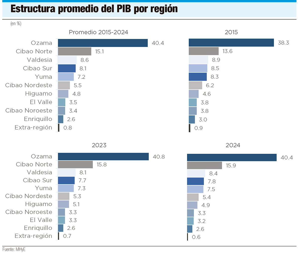 Según el informe, en la distribución regional del PIB para el periodo 2015-2024, la región Ozama registró la mayor participación, con un 40.4%. En segundo lugar, se encontró Cibao Norte (15.1%), seguida de Valdesia (8.6%) y Cibao Sur (8.1%). En el otro extremo se encontraron El Valle (3.5%), Cibao Noroeste (3.4%) y Enriquillo (2.6%).