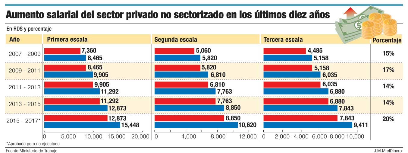 Desde 2015, mediante la Resolución 1/2015, el salario a los trabajadores aumentó un 14%, al pasar de RD$11,292 a RD$12,873, mientras que los que devengaban sueldos de RD$7,763 en 2013, actualmente cobran RD$8,850.