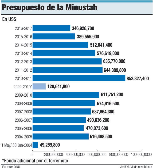 [dropcap]L[/dropcap]a Misión de las Naciones Unidas para la Estabilización en Haití (Minustah) pondrá fin a su componente militar a más tardar el próximo 15 de octubre, como parte de la finalización de un programa que manejó, desde sus inicios en mayo de 2004, un presupuesto de más de US$7,330.6 millones.