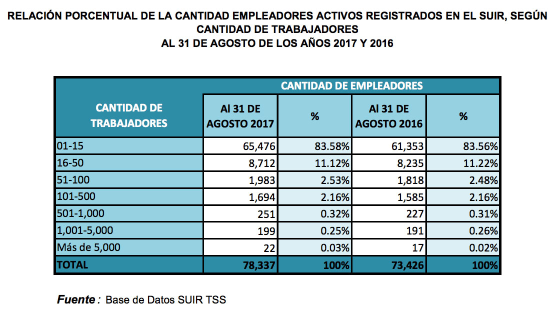 Del total de empleadores, el 94.7% de ellos son micro y pequeños empleadores con menos de 51 trabajadores. En el mismo sentido, la cantidad de empleadores registrados con el rango de 1-15 trabajadores crecieron en un número de 4,123 con relación al año 2016.