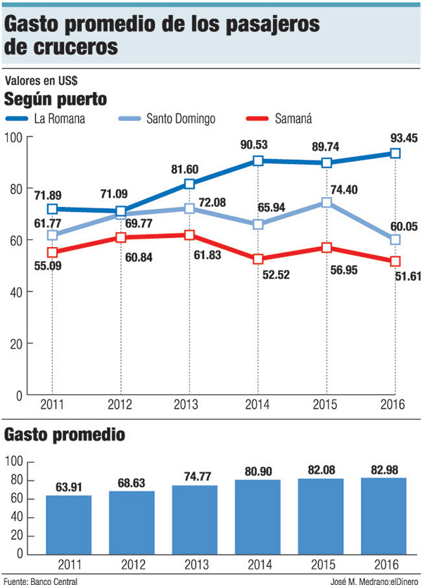 De acuerdo con los datos del Banco Central, en los últimos diez años la entrada de pasajeros por vía marítima ha crecido en promedio un 12% anual. Aumentó de 303,489 en 2006 a 809,286 en 2016.