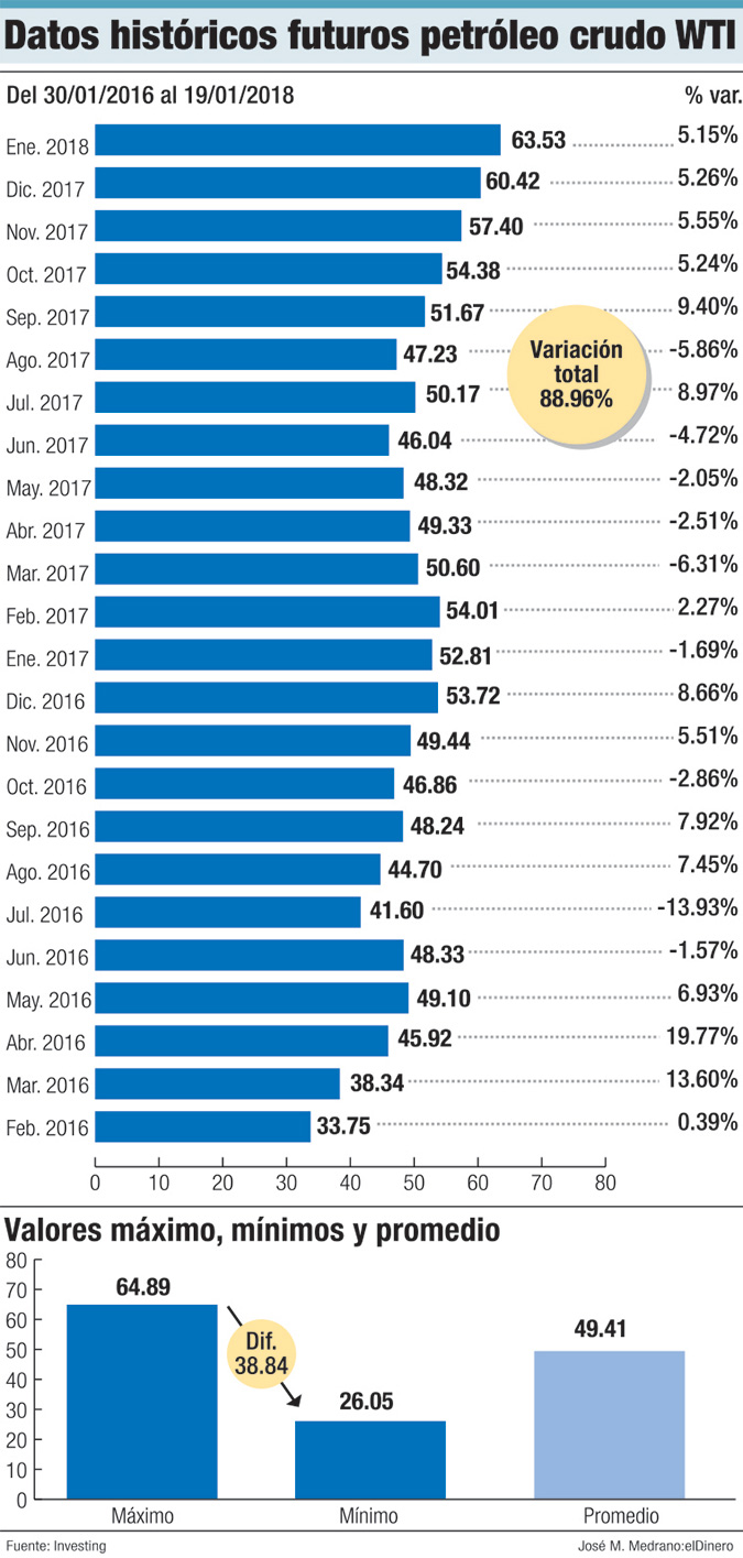 Según la referencia de los mercados internacionales, la cotización del barril de petróleo pasó de US$52.81 a US$63.53 entre enero de 2017 e igual mes de este año, lo que significa una recuperación neta de US$10.72, para un alza relativa de 20.3%. Estos precios se dan en un contexto en que Estados Unidos reporta una reducción constante en el inventario de sus reservas de petróleo.