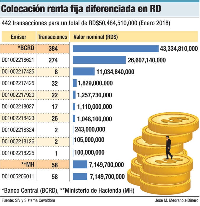 De acuerdo a la SIV, al 31 de enero de este año, la circulación de emisiones de renta fija diferenciada, emitidas por el Banco Central, ascienden a RD$520,448.8 millones (59.17%), las del Ministerio de Hacienda a RD$317,911.7 millones y US$846.8 millones (40.81%) y la de la Corporación Financiera Internacional, RD$180.3 millones (0.02%).