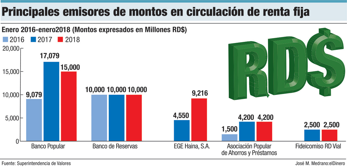 Al 31 de enero de 2018, habían circulado RD$48,206 millones por emisiones de renta fija, un 84% más que en 2015 cuando las emisiones se ubicaron en RS$26,144 millones. Mientras que las emisiones en dólares crecieron un 102%, al pasar de US$278.9 millones al 31 de enero de 2015 a US$566 millones en la misma fecha de 2018.