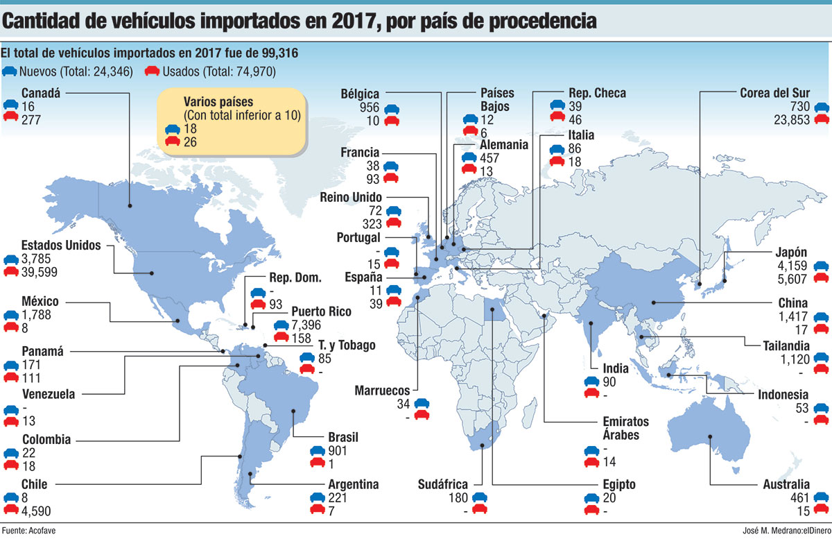 Enrique Fernández, presidente de Acofave, explica que la procedencia de unidades desde países como Trinidad y Tobago, desde el cual se importaron a territorio dominicano 85 unidades nuevas en 2017, puede deberse a personas que compran lotes de unidades “cero kilómetros o usadas” o de otro tipo de negocio y los traen al país.