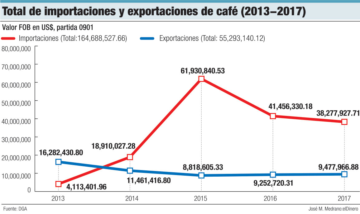 La Concafed, que agrupa a más de 20 mil productores organizados en 186 asociaciones a nivel nacional y tres federaciones en distintas regiones, estima que República Dominicana produce 300,000 quintales de café al año, de los que exporta unos 30,000. En cambio, importa más del doble de su producción anual para poder suplir la demanda del mercado.