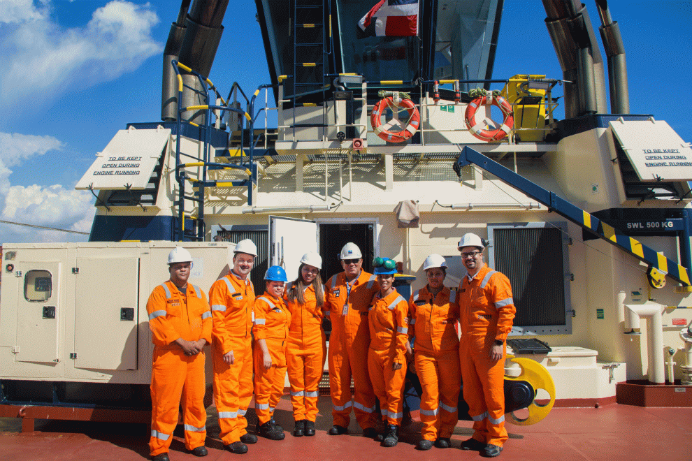 En una industria típicamente dominada por hombres, el barco Svitzer Monte Cristi es liderado por su capitán María de los Santos, acompañada por Moreno y apoyada por las marinas Paloma Montero, Loreanni Torres y Juana Custodio.