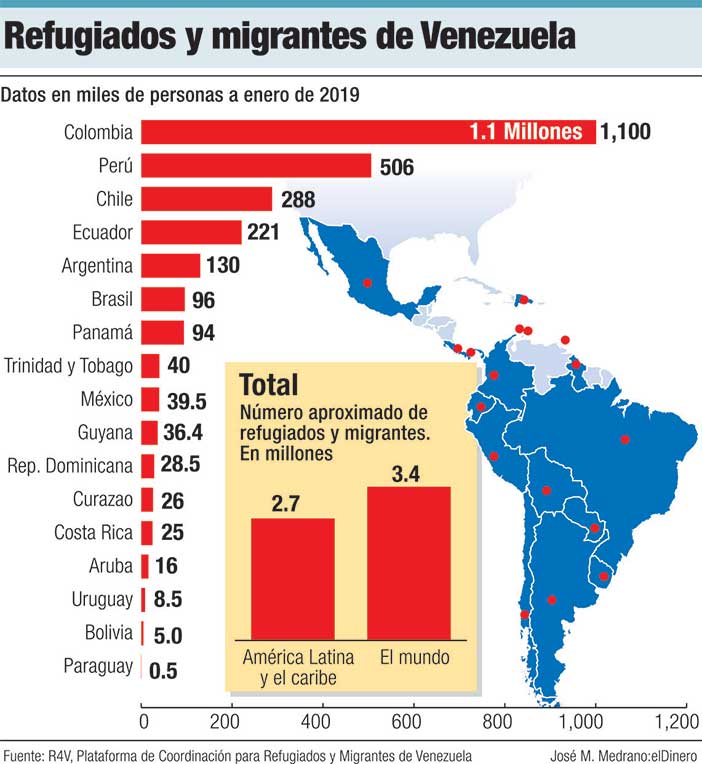 En el mundo hay unos 3.4 millones de venezolanos, de los que 2.7 millones se concentran en América Latina y el Caribe, según una plataforma regional integrada por el Alto Comisionado de las Naciones Unidas para los Refugiados (ACNUR) y la OIM.
