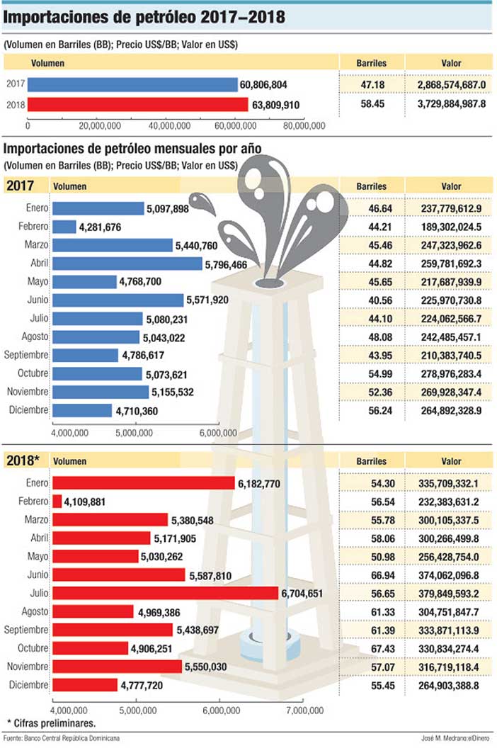 Estadísticas sustentadas por el Banco Central dan cuenta que en 2018 República Dominicana consumió 63.8 millones de barriles de petróleo y demás combustibles, lo cual llevó la factura a US$3,729.9 millones. Este monto representó un aumento neto de US$861.3 millones respecto a 2017, es decir, un 30%. El año pasado el consumo se disparó en 3,003,106 barriles de petróleo cuando se compara con el cierre de 2017, pues el año terminó en 60,806,804 de barriles de petróleo.