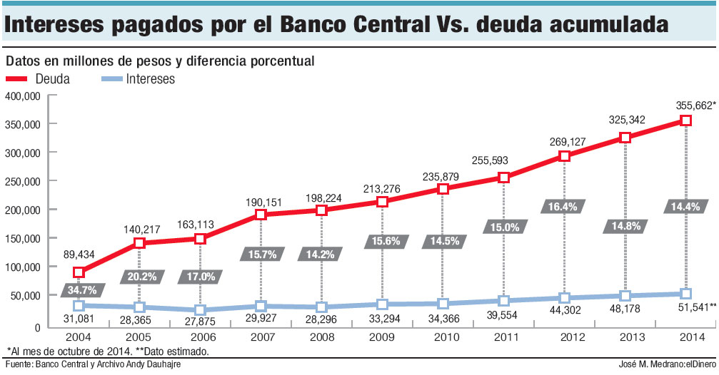 Para este 2015, el Gobierno debería aportarle al Banco Central RD$39,000 millones, pero en el Presupuesto sólo habilitó RD$21,000 millones. Esto obligará a la institución monetaria a emitir más deuda para captar los recursos que ha de pagar como intereses de la misma deuda, además de las emisiones adicionales que hace para controlar el circulante y evitar que se disparen la inflación y la tasa de cambio.