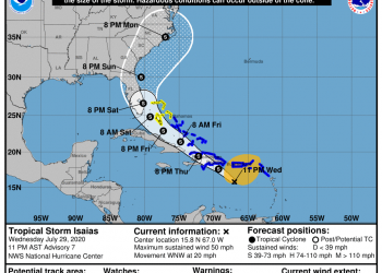 La tormenta tropical Isaías, con vientos máximos sostenidos de 60 millas por hora (95 km/h), golpea a Puerto Rico, mientras ...